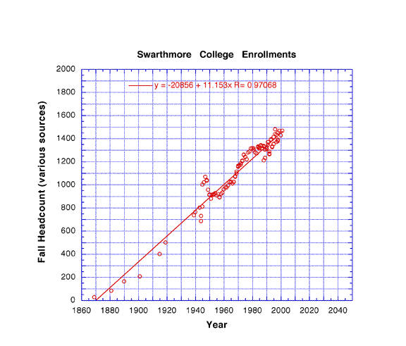 Figure 2: A version of the data in Figure 1 plotted with the best-fit straight line through all points. In this calculation, all data were considered equally valid. The regression equation has a slope of approximately 11.2 students/year, which is the average enrollment growth at Swarthmore College over its history based upon these data. The correlation coefficient is 0.97, indicating a very good fit of the line to the data. Thus, discussions of past enrollments should refer to linear, not exponential, enrollment growth.